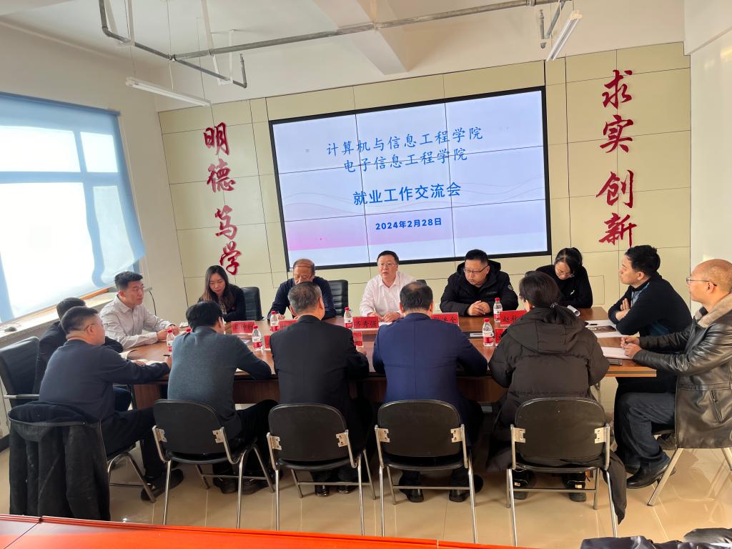 会上,齐秀强对计算机学院一行表示热烈欢迎,并简要介绍了电信学院毕业生就业情况;杨庆江围绕“本科生导师制、就业实习“一体化”、大学生科创活动、指导教师就业包保责任制”等方面介绍了就业工作的经验做好;电信学院就业辅导员、教研室主任围绕毕业生就业观念的转变、实习实训的安排、毕业设计指导教师作用的发挥等方面介绍了经验,并就计算机学院领导老师提出的学生就业相关问题交流了做法。与会人员还就人才培养质量提升、大学生创新能力培养、实习实践能力考核等方面交换了意见。