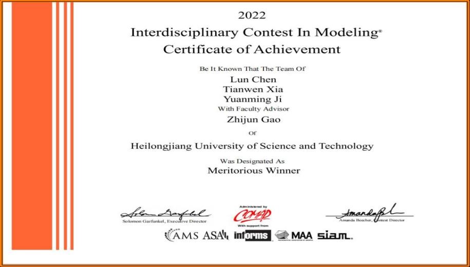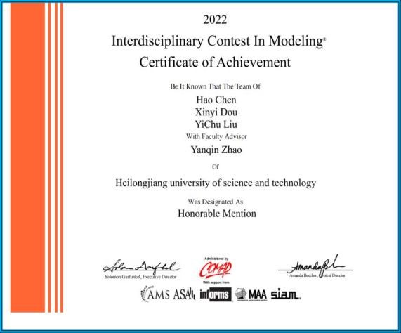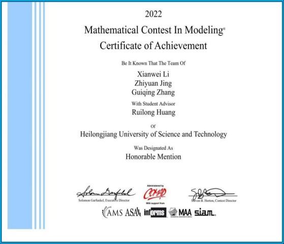 主要获得了2022和2023年美国大学生国际数学建模竞赛国际一等奖(Meritorious)3项,国际二等奖(Honourable Metion)7项。