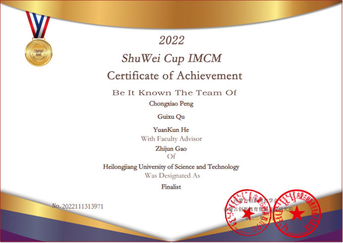 2021和2022年“数维杯”国际大学生数学建模挑战赛提名奖(Finalist)2项、国际赛一等奖(Meritorious)4项、国际赛二等奖(Honourable Metion)9项。