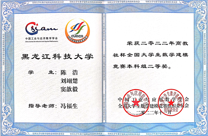 2021和2022年东三省数学建模联赛获省一等奖6项;2022年MathorCup数学建模挑战赛全国二等奖2项,全国三等奖3项;2022年钉钉杯全国大学生数据分析竞赛全国二等奖5项。